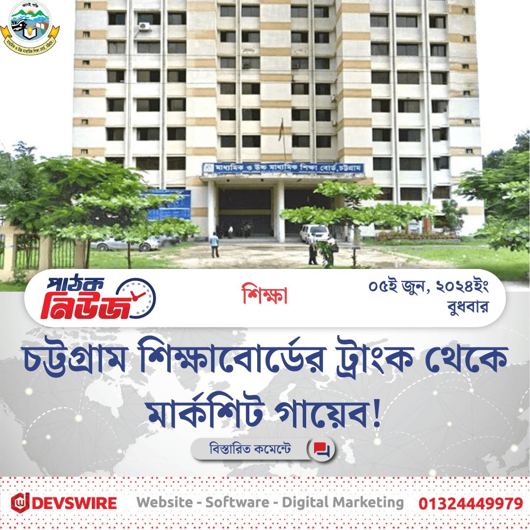 চট্টগ্রাম শিক্ষা বোর্ডের ট্রাংক থেকে ২০২৩ সালের এইচএসসি পরীক্ষার্থীদের দুটি মার্কশিট উধাও হয়ে গেছে৷ এ ঘটনায় নগরীর পাঁচলাইশ থানায় জিডি করেছেন বোর্ডের উপ পরীক্ষা নিয়ন্ত্রক মোহাম্মদ দিদারুল আলম৷