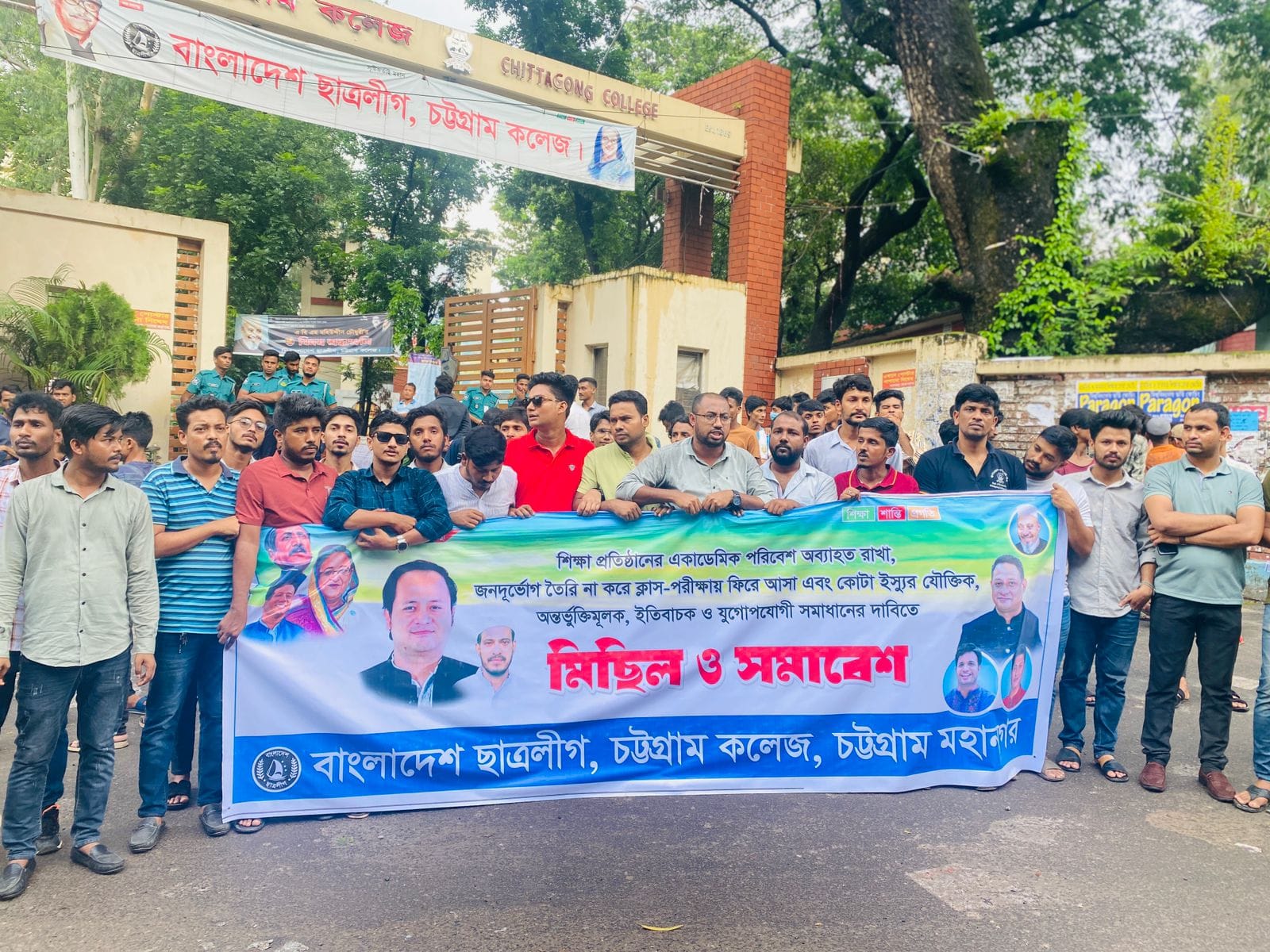 শিক্ষা প্রতিষ্ঠানের একাডেমিক পরিবেশ অব্যাহত রাখা, জনদুর্ভোগ তৈরি না করে ক্লাস-পরীক্ষায় ফিরে আসা এবং কোটা ইস্যুর যৌক্তিক, অন্তর্ভুক্তিমূলক, ইতিবাচক ও যুগোপযোগী সমাধানের দাবিতে চট্টগ্রাম কলেজ ছাত্রলীগের মিছিল ও সমাবেশ।