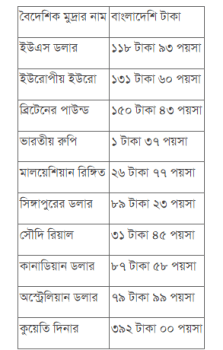 বিশ্বের বিভিন্ন দেশের সঙ্গে বাংলাদেশের ব্যবসা-বাণিজ্য দিনকে দিন সম্প্রসারিত হচ্ছে। ব্যবসায়িক লেনদেন ঠিক রাখার জন্য তাই মুদ্রা বিনিময়ের পরিমাণও বৃদ্ধি পেয়েছে। শুধু তাই নয়, বিশ্বের বিভিন্ন দেশে বসবাসরত প্রবাসীরা নিয়মিত পাঠাচ্ছেন বৈদেশিক মুদ্রা। লেনদেনের সুবিধার্থে বিভিন্ন দেশের মুদ্রার সঙ্গে বাংলাদেশি টাকার ১৯ আগস্ট ২০২৪ তারিখে বিনিময় হার তুলে ধরা হলো-